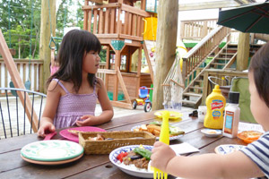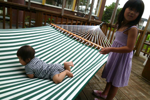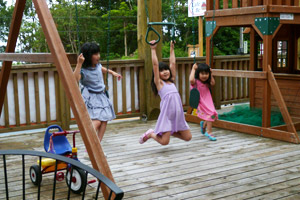 大きなウッドデッキには、ブランコやハンモック、