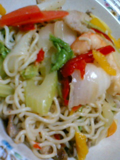 5・焼きソバを炒め、そこに豚、海老、野菜をもどす