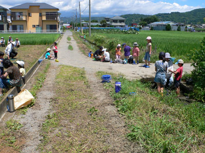 子どもたちは近くの用水路でバチャバチャと水遊び